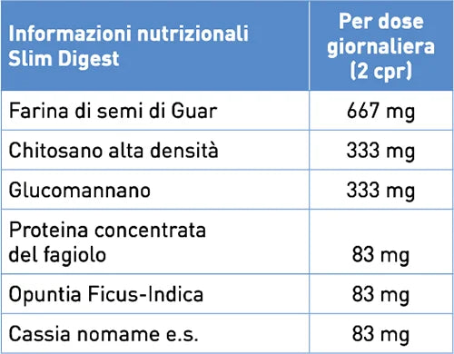 Farina di semi di Guar, Chitosano alta densità, Glucomannano, Proteina concentrata del fagiolo, Opuntia, Ficus-Indica, Cassia nomarn